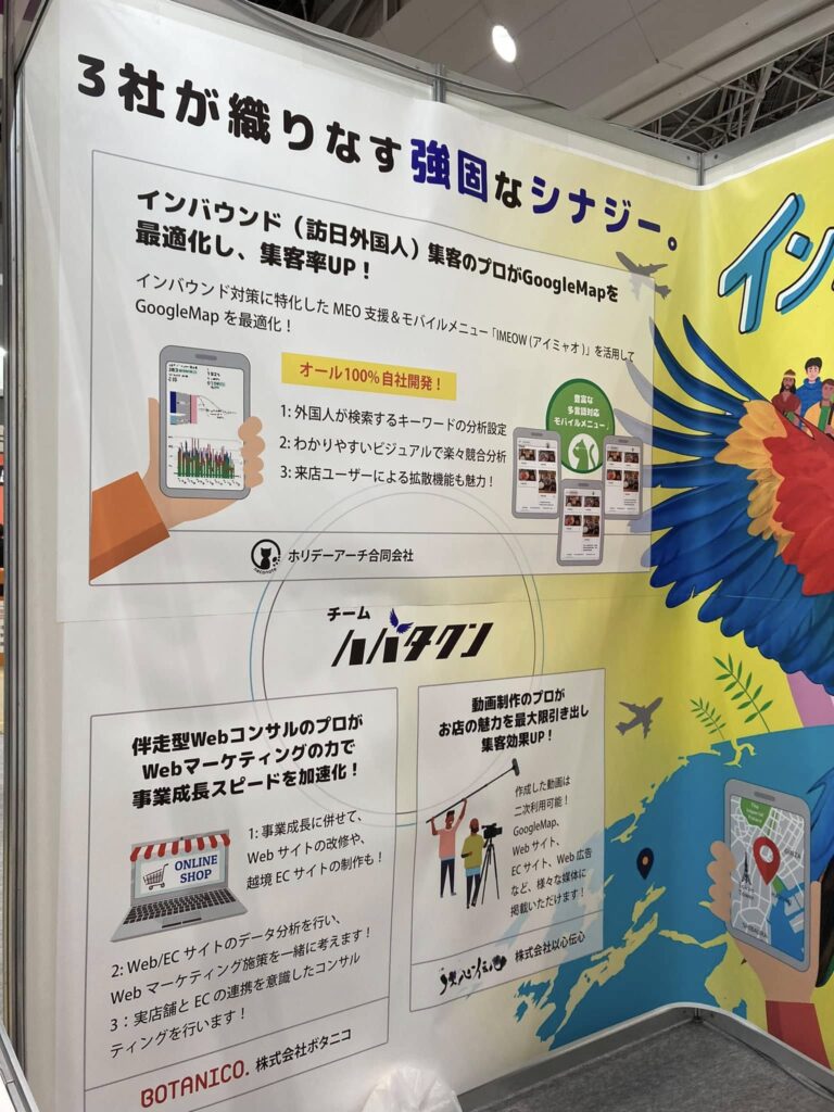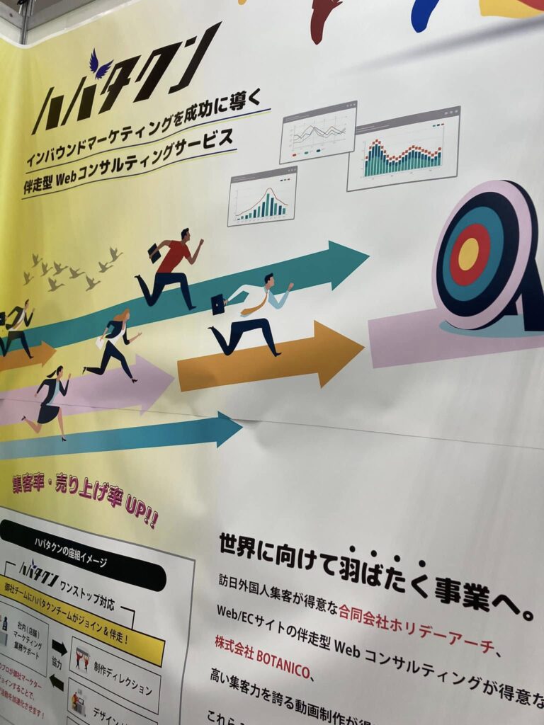 今回は、パートナー企業様である合同会社ホリデーアーチ、株式会社以心伝心と3社合同で出展いたしました。弊社のメインサービスである「定額制専属WebマーケティングサービスASHINAMI」と、ホリデーアーチ社の得意とする店舗向けインバウンドマーケティング、以心伝心社の得意とする動画制作を組み合わせ、”世界に向けて羽ばたく事業へ”をコンセプトにした「ハバタクン」というサービスにて出展をおここない、多くのお客様にご来場いただき、ご興味をお持ちいただくことができました。